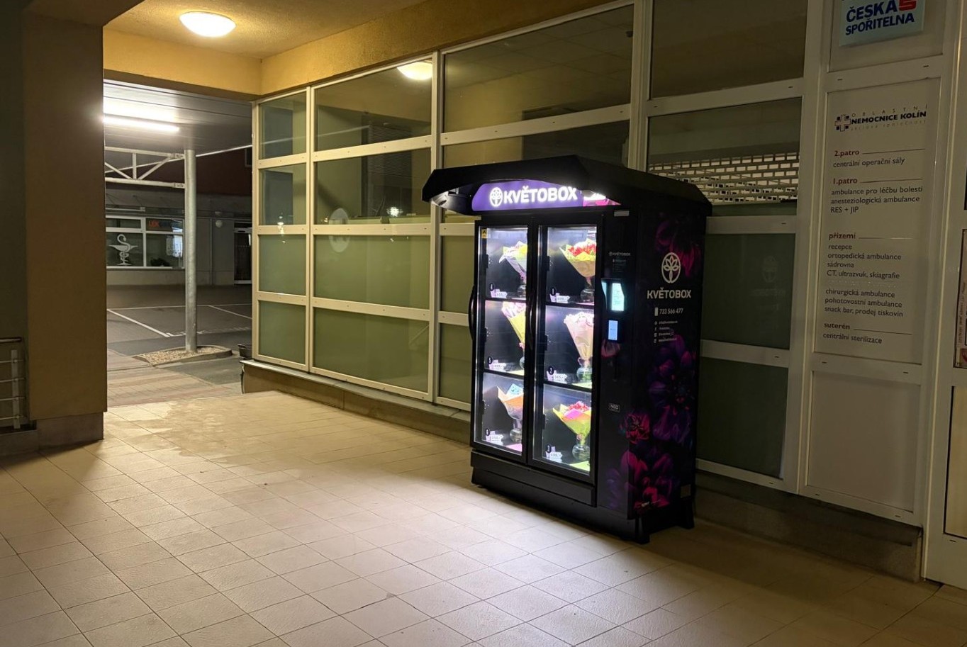 Když zapomenete na dárek, KVĚTOBOX vás zachrání. Čerstvé kytice 24/7 přímo v areálu kolínské nemocnice. Rychle, bez čekání a s platbou kartou.